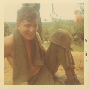Well I’ve made 2 air assaults since I’ve been here. That’s when the company is picked up in copters and when everyone is in the air, two copters shoot the area where you are going to land with rockets. Each copter has 48 rockets. Then the copters with us aboard circle the area, then come in for a landing and as they come in two M60 machine guns, on each side of the copter, start shooting until just before you start to land, then we jump out. Sometimes the copters are as far as 5 feet off the ground and you have to jump down with about 60-70 pounds of gear and boy do you hit the ground.