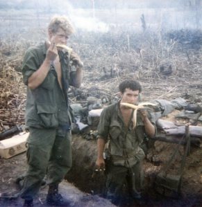 Yesterday 4 choppers came and picked up our platoon from a rice paddy. I was on ship #4 so I asked one of the door gunners on the ship if he knew Lenny Knudson and he said he was on one of the ships so I started to look around and I saw him on #3. When we landed at the LZ I ran over to his ship, I was only able to talk to him a few seconds but today he came in on his ship and his ship stayed here for a while so I talked to him for about 10 minutes. I sure never thought I’d see him over here. I never dreamed of both of us going to fight in a war. It seems like those days are so far gone and I feel so much older now.