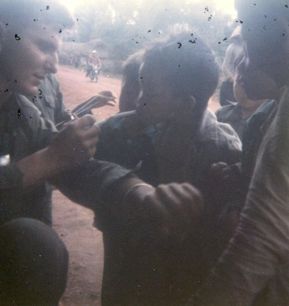 Over here everything is either No. 1 or No. 10 with the people. No. 1 means best and No. 10 the worst. A lot of times when we come to a village the kids come running up to us and say, “GI, No. 1”. Sometimes when we are searching a village some of us guys go to some hut and talk to the kids and the men and women. At one hut there was this one kid that was trying to teach me their language, he’d point to something and say what it was and so forth. Some of the kids are smart and know some English. They call the men over here Papasan and women Mamasan and kids Babysan.
